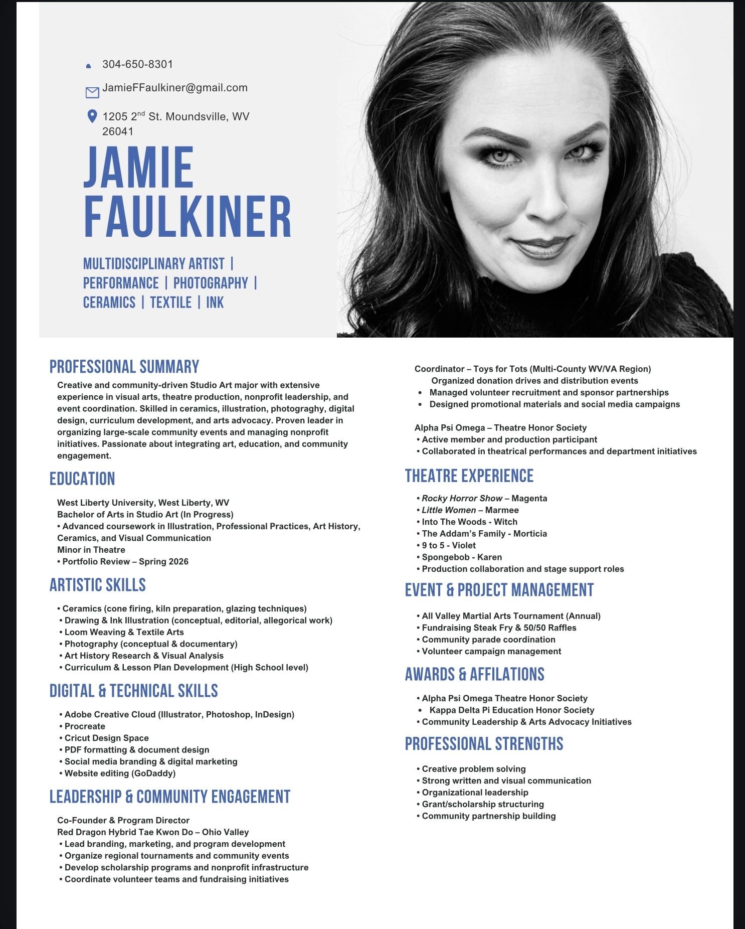 Creative and community-driven Studio Art major with extensive experience in visual arts, theatre production, nonprofit leadership, and event coordination. Skilled in ceramics, illustration, photograghy, digital design, curriculum development, and arts advocacy.